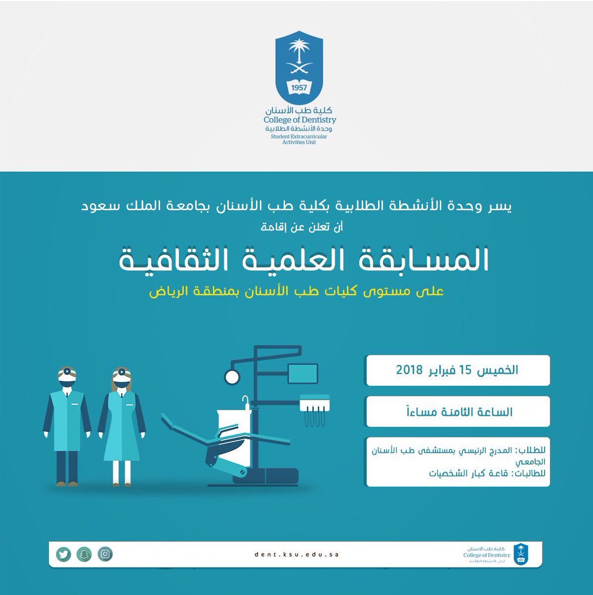 كلية طب الأسنان On Twitter غدا المسابقة العلمية الثقافية على مستوى كليات طب الاسنان بمنطقة الرياض بتنظيم من وحدة الانشطة الطلابية في كلية طب الاسنان بجامعة الملك سعود كونوا على الموعد Https T Co Cisfdsohmi