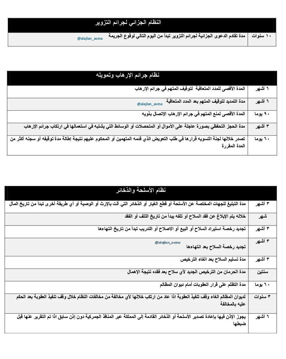 مختارات عدلية On Twitter المدد النظامية في الانظمة الجنائية نظام الإجراءات الجزائية نظام مكافحة غسل الأموال نظام الأحداث النظام الجزائي لجرائم التزوير نظام جرائم الإرهاب وتمويله نظام الأسلحة والذخائر نظام